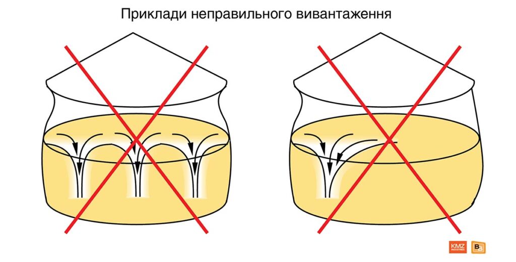 Як вищевикладені складнощі впливають на щоденну роботу оператора? Все просто. Пам’ятаєте головне правило експлуатації? «Вивантаження повинно проводитися тільки через центральний вивантажувальний отвір в днищі до тих пір, поки над цим отвором не залишиться зерна. Вивантаження через бічні вивантажувальні отвори повинно здійснюватися лише тоді, коли проведене повне вивантаження через центральний отвір».